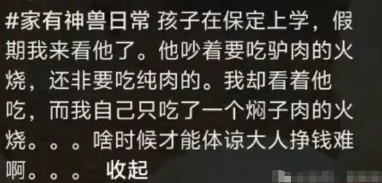 大學,家長感慨兒子上大學了都不懂掙錢的苦" alt="原創"16塊的火燒張口就要吃",家長感慨兒子上大學了都不懂掙錢的苦">